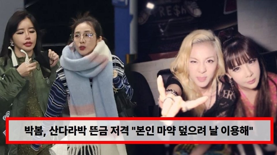박봄은 산다라박(산다라 박)이 마약 사용으로 적발되었으며, 자신이 이를 "커버하기 위해" 마약 사용자로 지목되었다는 주장을 제기했습니다. 그는 "박산다라가 마약으로 걸려서 그걸 커버하기 위해서 박봄을 마약쟁이로 만들었습니다"라고 명시적으로 표현했습니다. 또한 그는 양현석(YG엔터테인먼트 전 대표), 테디(프로듀서), 그리고 씨엘(이채린)을 지명하며, 이들이 자신의 복용량을 과장해서 보고했다고 주장했습니다.